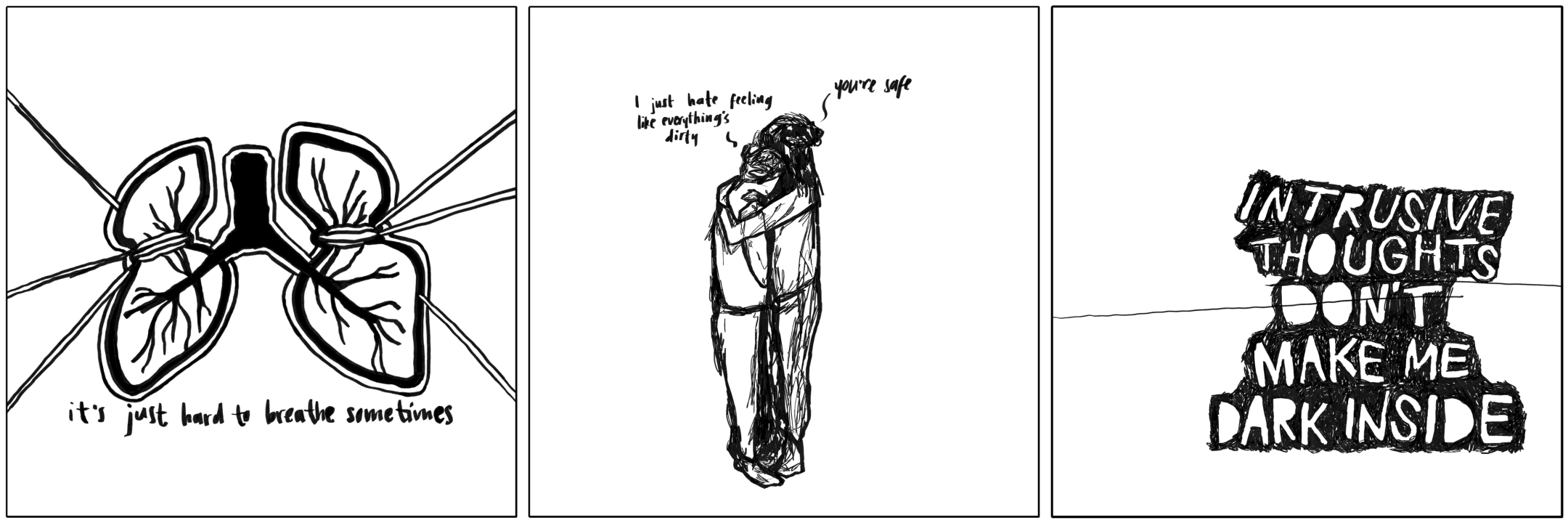 I started scribbling doodles about what I was thinking, feeling, and experiencing. For example, I drew the tied-up lungs piece when I kept having panic attacks, and my chest felt tight all the time. Or when I struggled with contamination fears, I would cry about feeling dirty, and my roommate would hug and reassure me.