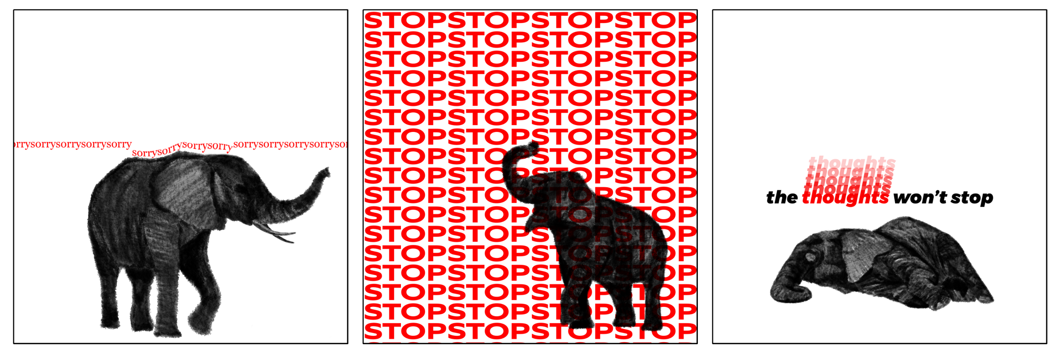 Going off of that, your intrusive thoughts + elephants art pieces have a lot of interesting elements. I notice that elephants are used a lot in the OCD space because of the “pink elephant” exercise. Also, just the way intrusive thoughts can take up so much mental space. Can you explain this piece, and why you decided to include those certain phrases?