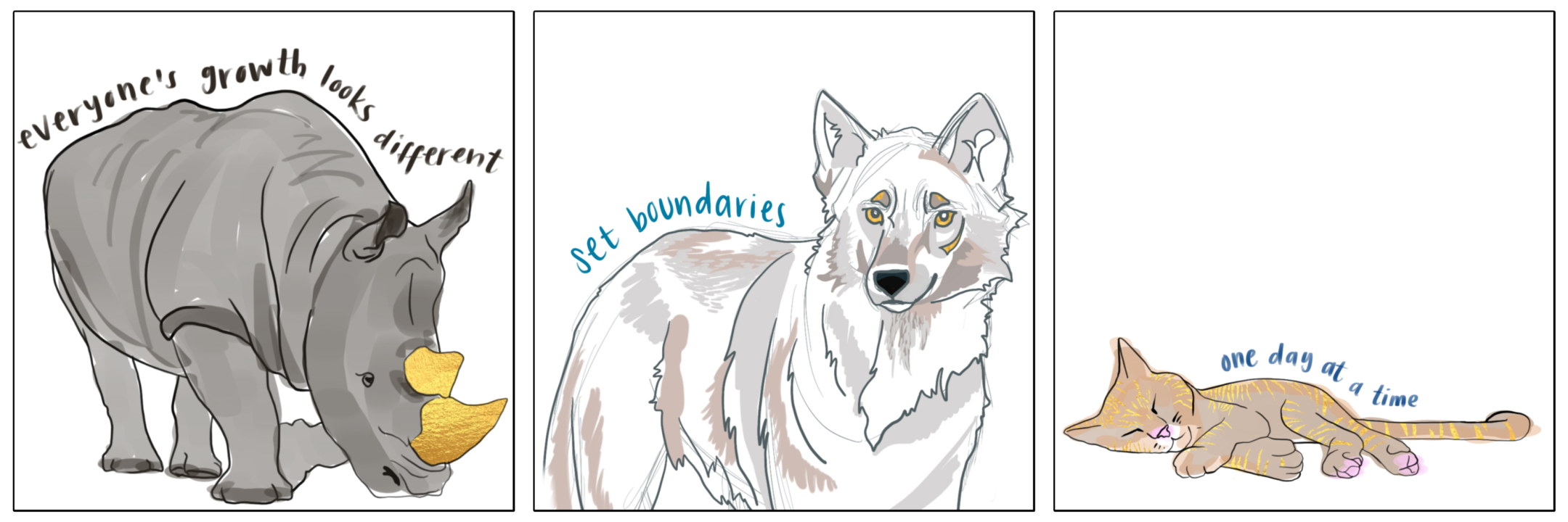I started this series by digitally painting “tough” animals, like rhinos, elephants, and whales. I’ve always been bad at taking compliments and giving myself affirmations, so pairing animals that had tough exteriors with soft affirmations was personal to me. As I continued the series, the animals became softer — tigers, panthers, wolves. Eventually, I moved to drawing more domesticated animals, and got more comfortable with affirmations (although we still have a ways to go).