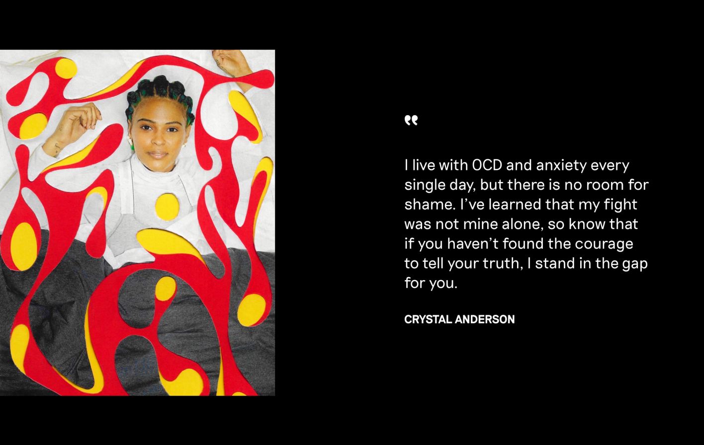 Crystal Anderson is an advocate, fashion enthusiast, cofounder of A Very Good Job, and a Made of Millions board advisor. Over the years, she's been open about the ups and downs of her mental health, in particular her experiences with OCD and depression, and how her life as a Black queer woman intersects with her emotional wellbeing.